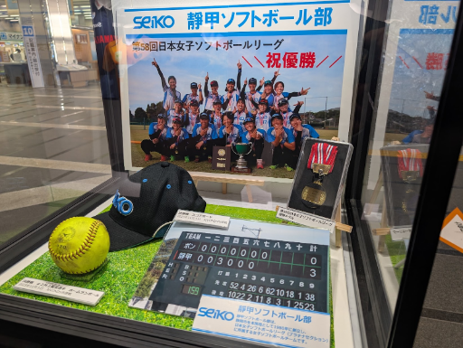 2025/12/25 お知らせ 静岡市役所にて特別展示されました 静岡市役所内の1階フロアに、第58回日本女子ソフトボールリーグ優勝記念の特別展示コーナーを設置していただきました。 優勝メダルをはじめ、井上選手が決勝戦で放ったホームランボールなどを展示していただいております。 より多くの皆さまに靜甲ソフトボール部を知っていただきたく、是非ご覧いただければと思います。
