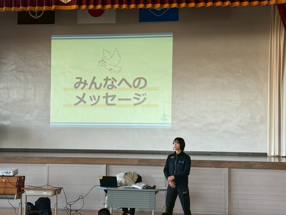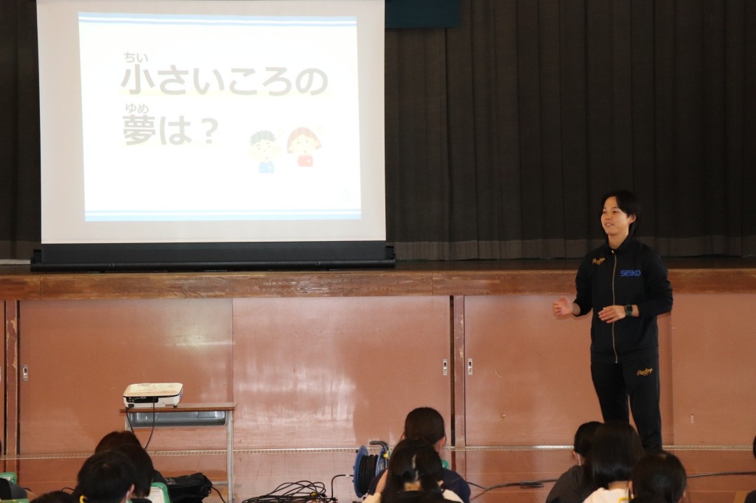 当部からは、半田選手と伊藤選手が講師となり、前半はボール投げの実技で一緒に体を動かし、後半は夢をテーマにした