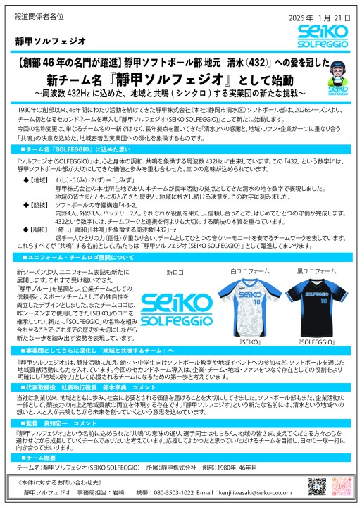 2026/01/21 お知らせ 2026年シーズンより『靜甲ソルフェジオ』として始動します 日頃より、靜甲ソフトボール部への温かいご指導、ご声援ありがとうございます。 このたび、「靜甲ソフトボール部」は創部以来初となるセカンドネームの導入を行い、 新たに「靜甲ソルフェジオ」として活動を開始いたします。 地域・社会そしてファンの皆さまと寄り添いながら、共に戦っていきたい想いを込め、 「ソルフェジオ」のセカンドネームと共に活動してまいります。 今後とも、靜甲ソルフェジオをよろしくお願いいたします。