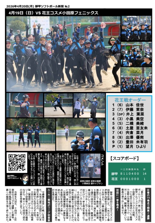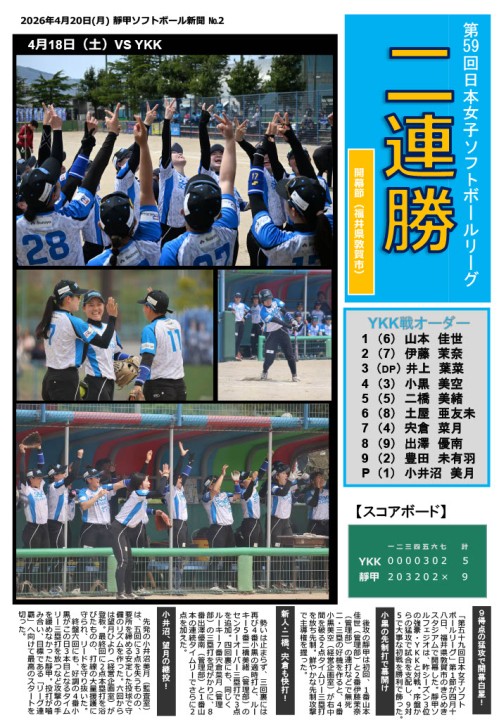 2026/04/20 お知らせ 「第59回日本女子ソフトボールリーグ」第1節福井大会開催 4月18日(土)・19日(日) 福井県きらめきスタジアムにて「第59回日本女子ソフトボールリーグ」福井大会が開催されました。 リーグ2連覇を目指す中、全員総力で戦い、開幕2連勝の好スタートを切ることができました。 5月15日(金)~17日(日)に開催の第2節小田原大会でも勢いをそのままに戦い抜きます。 当日の試合の様子を今回より「ソフトボール新聞」として配信いたします。ぜひご覧ください。